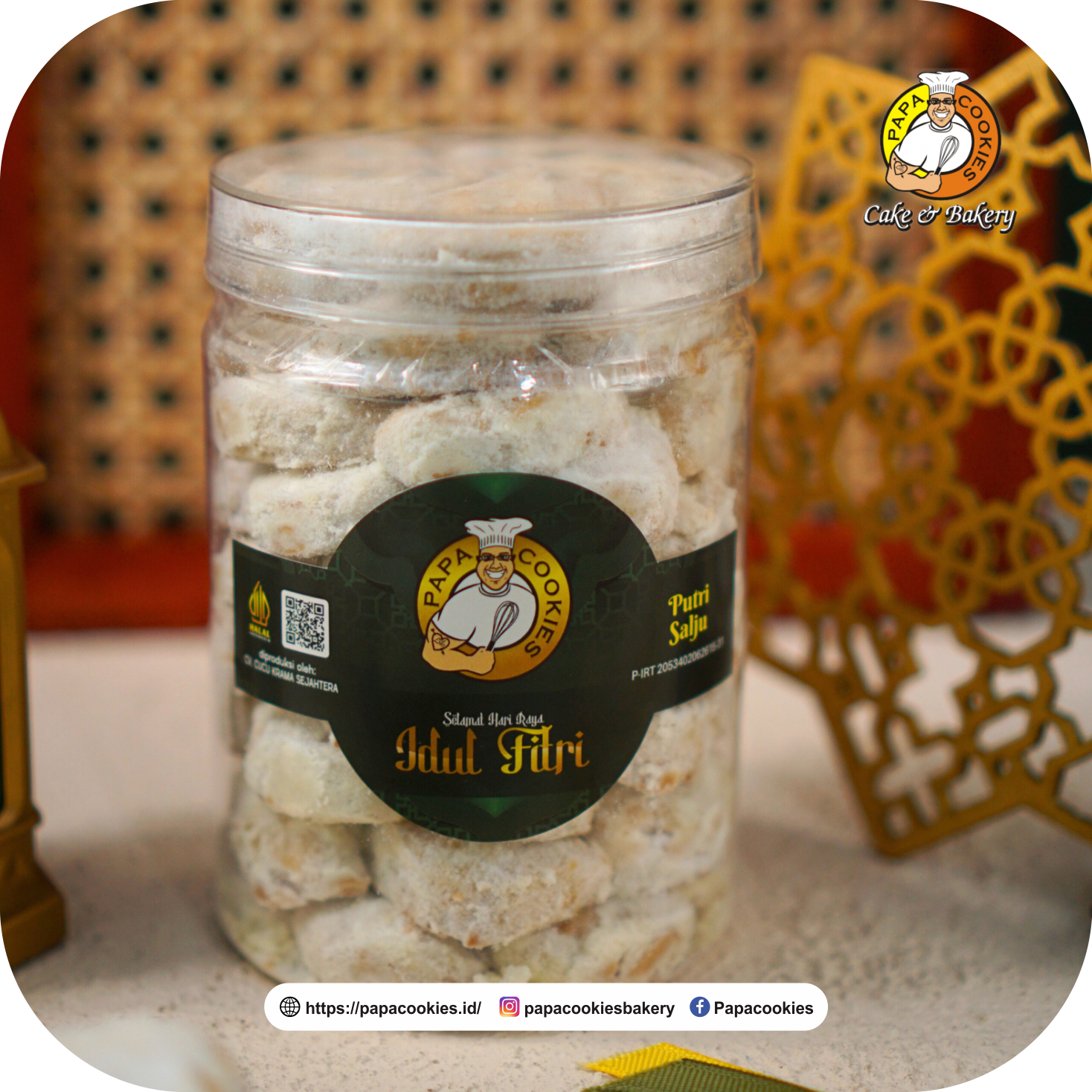 Kue kering Putri Salju by Papacookies, tektsurnya lembut dengan balutan gula halus yang pas. Hadir dengan packaging yang lebih besar dan isi lebih banyak, lebih puas untuk dinikmati bersama. Rasanya manisnya ngga berlebihan, bisa jadi pelengkap camilan di meja lebaranmu.