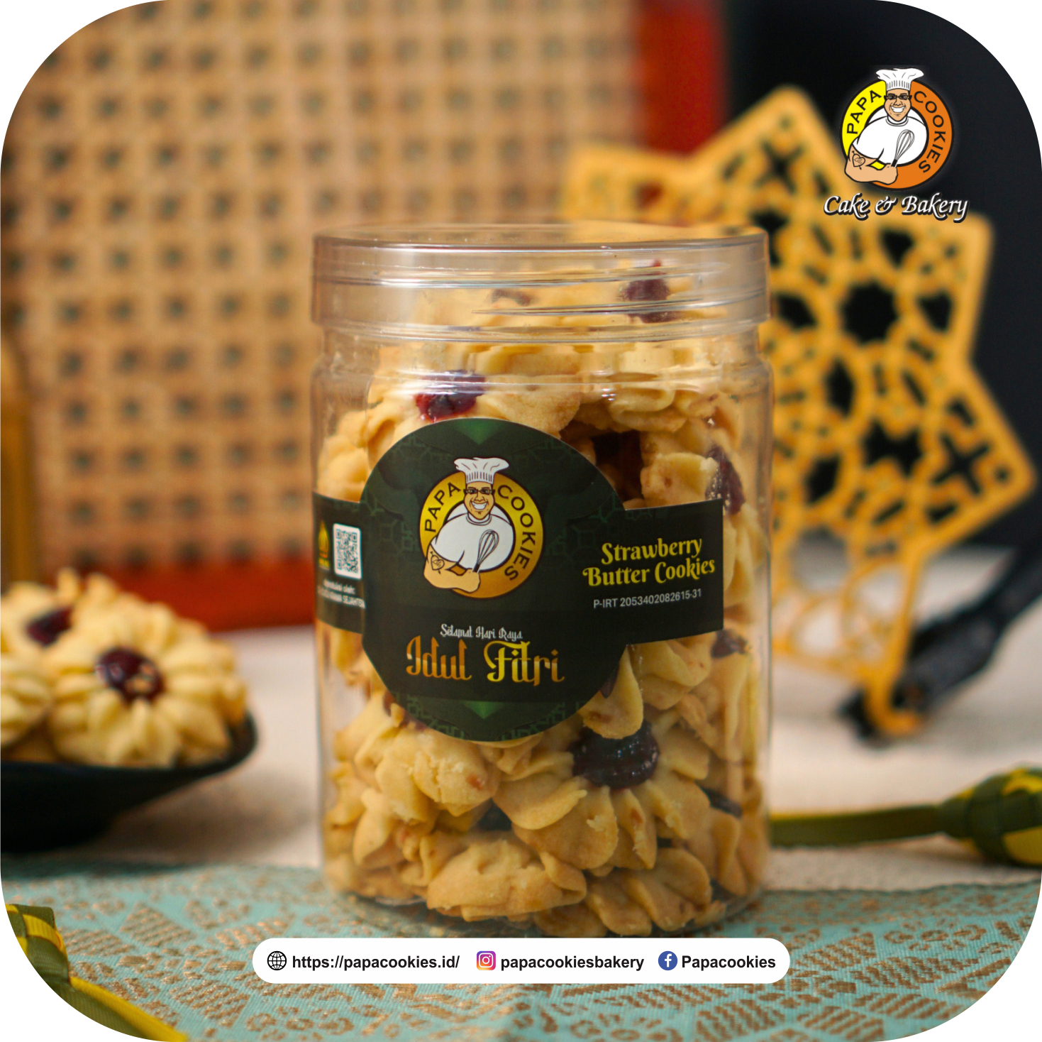 Strawberry butter cookies by Papacookies, kue kering renyah dengan topping selai strawberry di tengah nya. Hadir dengan packaging yang lebih besar dan isi lebih banyak, lebih puas untuk dinikmati bersama. Perpaduan rasa manis yang pas untuk hidangan tamu di momen lebaran.
